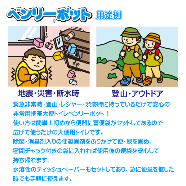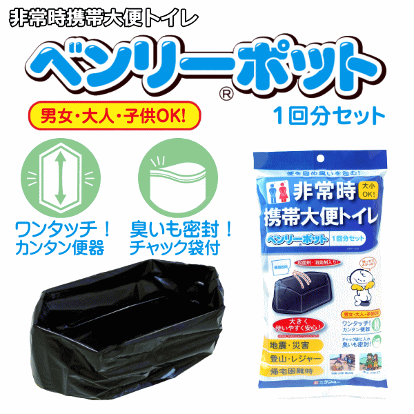 【主な仕様】 ●商品名:ベンリーポット 1回分セット ●素材 ・便器枠:ダンボール ・畜便袋・持ち帰り袋・密封袋:ポリエチレン ・便凝固剤(殺菌剤・消臭剤入):高分子吸水樹脂、殺菌剤、消臭剤 ●サイズ・容量 ・本体(組立式):W330×H115×D155mm 重量:45g ・パッケージ:W145×H260×D370mm 重量:80g【特徴】 ・便器を広げて置くだけで、どこででもすぐに使える大便用トイレです。
