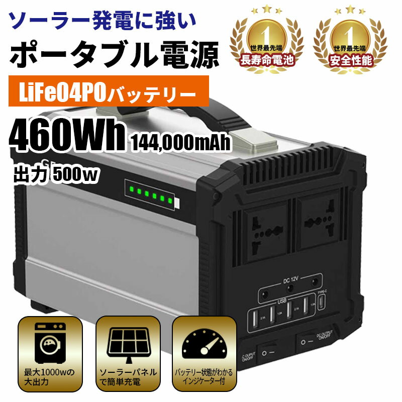 長寿命寿命 使える ポータブル電源 大容量460Wh 144000mAh フレキシブル 70w ソーラーパネル付 定格500w出力 リン酸鉄リチウム電池 PSE コンセント 太陽光で充電 家庭用コンセント シガーソケット USB TypeC 10ポート G500L